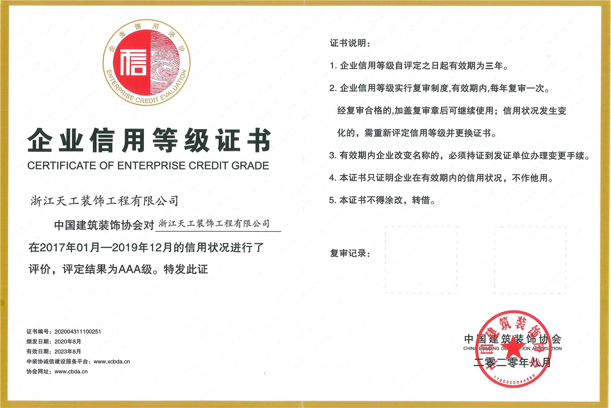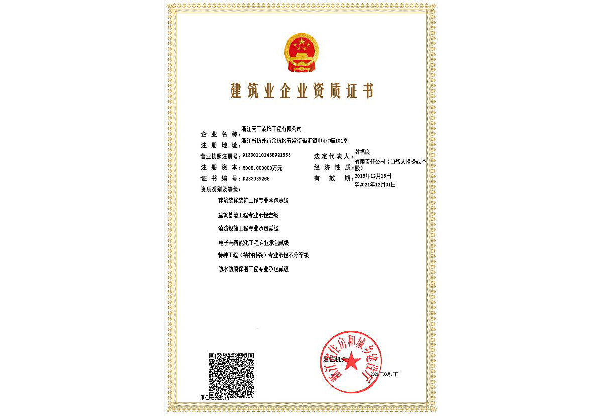 浙江天工裝飾工程有限公司成立于1994年,是一家專注于建筑行業(yè)近三十年,余杭區(qū)內(nèi)規(guī)模最大、最專業(yè)的現(xiàn)代化專業(yè)承包企業(yè),連續(xù)十二年榮獲“余杭區(qū)建筑業(yè)十強(qiáng)企業(yè)”稱號(hào)。公司現(xiàn)任余杭區(qū)建筑裝飾行業(yè)協(xié)會(huì)會(huì)長(zhǎng)單位、杭州市建筑裝飾行業(yè)協(xié)會(huì)副會(huì)長(zhǎng)單位、浙江省建筑裝飾行業(yè)協(xié)會(huì)副會(huì)長(zhǎng)單位、中國(guó)建筑裝飾協(xié)會(huì)理事單位。公司具備建筑裝修裝飾工程專業(yè)承包壹級(jí)、建筑幕墻工程專業(yè)承包壹級(jí)、建筑裝飾工程設(shè)計(jì)專項(xiàng)甲級(jí)、建筑幕墻工程設(shè)計(jì)專項(xiàng)甲級(jí)、展覽陳列工程設(shè)計(jì)施工一體化貳級(jí)、電子與智能化工程專業(yè)承包貳級(jí)、消防設(shè)施工程專業(yè)承包貳級(jí)、防水防腐保溫工程專業(yè)承包貳級(jí),集建筑工程施工總承包、建筑機(jī)電安裝、城市及道路照明、鋼結(jié)構(gòu)、結(jié)構(gòu)補(bǔ)強(qiáng)、安防施工等多項(xiàng)資質(zhì)。主要從事大型公共建筑、星級(jí)酒店的室內(nèi)精裝修、建筑幕墻及建筑智能化工程的設(shè)計(jì)與施工。 天工裝飾始終把建筑裝飾當(dāng)作一項(xiàng) “美的事業(yè)”,在施工中嚴(yán)把質(zhì)量關(guān),不斷規(guī)范和提升工程技術(shù)標(biāo)準(zhǔn)。近年來(lái),公司承建的浙商開元名都國(guó)際酒店I標(biāo)段裝飾工程、杭州藝尚雷迪森廣場(chǎng)酒店裝修工程、余杭區(qū)時(shí)代廣場(chǎng)5號(hào)樓(市民之家)室內(nèi)裝飾工程、永安之星室內(nèi)裝飾工程、青山湖科技城創(chuàng)業(yè)廣場(chǎng)裝修工程、杭州未來(lái)科技城醫(yī)院室內(nèi)裝飾工程、杭州師范大學(xué)附屬實(shí)驗(yàn)學(xué)校裝修工程、杭州老板電器股份有限公司辦公樓裝飾工程、深川控股集團(tuán)綜合樓幕墻工程、浙江省科技信息研究院幕墻工程、北航杭州創(chuàng)新研究院(余杭)內(nèi)裝及智能化提升改造項(xiàng)目(研究生院)工程、臨平新城人才服務(wù)中心設(shè)計(jì)釆購(gòu)施工(EPC)工程總承包項(xiàng)目、浙江大學(xué)先進(jìn)電氣裝備創(chuàng)新中心室內(nèi)外裝飾及改造項(xiàng)目設(shè)計(jì)采購(gòu)施工(EPC)工程總承包項(xiàng)目等,先后獲得“中國(guó)建筑工程裝飾獎(jiǎng)”、“全國(guó)建筑裝飾科技創(chuàng)新獎(jiǎng)”、浙江省建設(shè)工程“錢江杯”優(yōu)質(zhì)工程獎(jiǎng)、杭州市建設(shè)工程“西湖杯”優(yōu)質(zhì)工程獎(jiǎng)、嘉興市建設(shè)工程“南湖杯”優(yōu)質(zhì)工程獎(jiǎng)、“浙江省優(yōu)秀建筑裝飾工程獎(jiǎng)”、“浙江省優(yōu)質(zhì)安裝質(zhì)量獎(jiǎng)”等榮譽(yù)。 天工裝飾恪守“誠(chéng)實(shí)守信、文明經(jīng)營(yíng)”,近年來(lái)公司得到了客戶的信賴也獲得了業(yè)界的好評(píng),先后被評(píng)為“國(guó)家級(jí)守合同重信用單位”、“全國(guó)建筑裝飾行業(yè)AAA級(jí)信用企業(yè)”、“全國(guó)百家科技創(chuàng)新型企業(yè)”、“浙江省AAA級(jí)守合同重信用單位”、“人民銀行信用等級(jí)AAA級(jí)企業(yè)”、“浙江省信用管理示范企業(yè)”、“浙江省誠(chéng)信企業(yè)”、“浙江省建筑裝飾行業(yè)強(qiáng)優(yōu)企業(yè)”、“杭州市建筑業(yè)優(yōu)秀企業(yè)”、“余杭區(qū)建筑業(yè)十強(qiáng)企業(yè)”、 “余杭區(qū)人民政府質(zhì)量獎(jiǎng)”等榮譽(yù)。